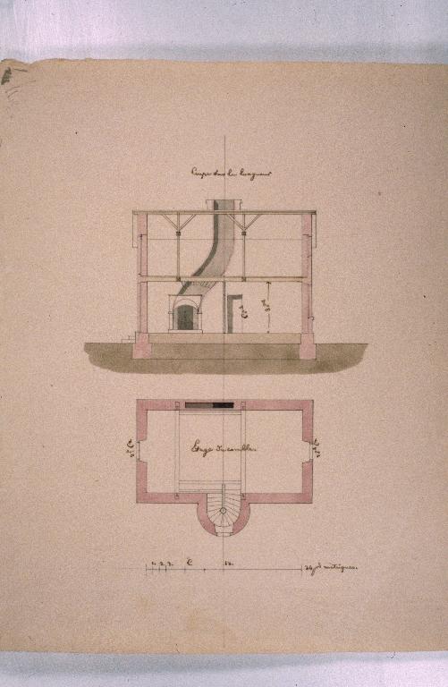 Pavillon d'entrée du château de Largentaye : vue en coupe et plan au sol du premier étageImmatriculation