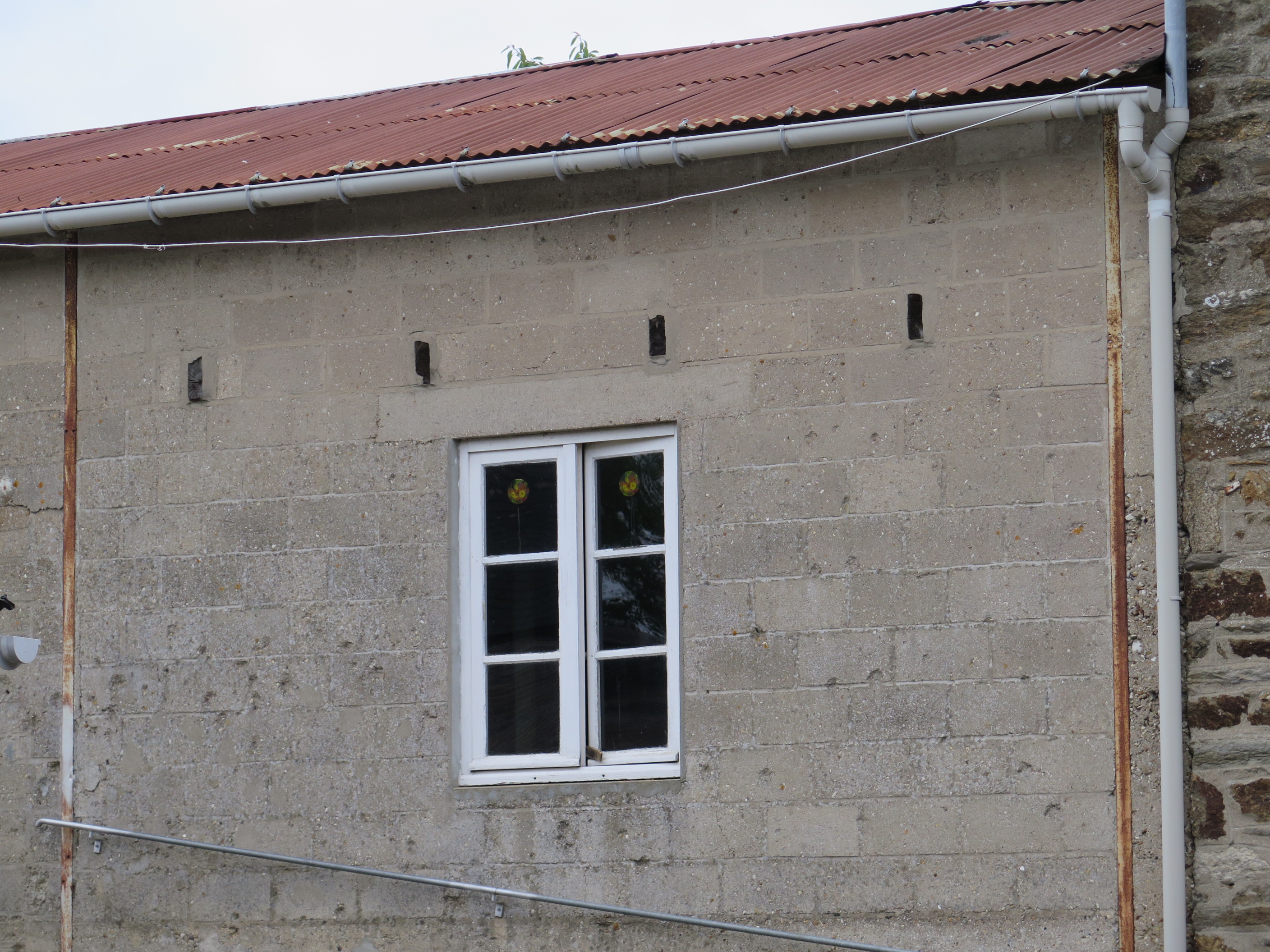 Vue des impacts de balles sur la façade d'une dépendance, la Rogerais.Immatriculation