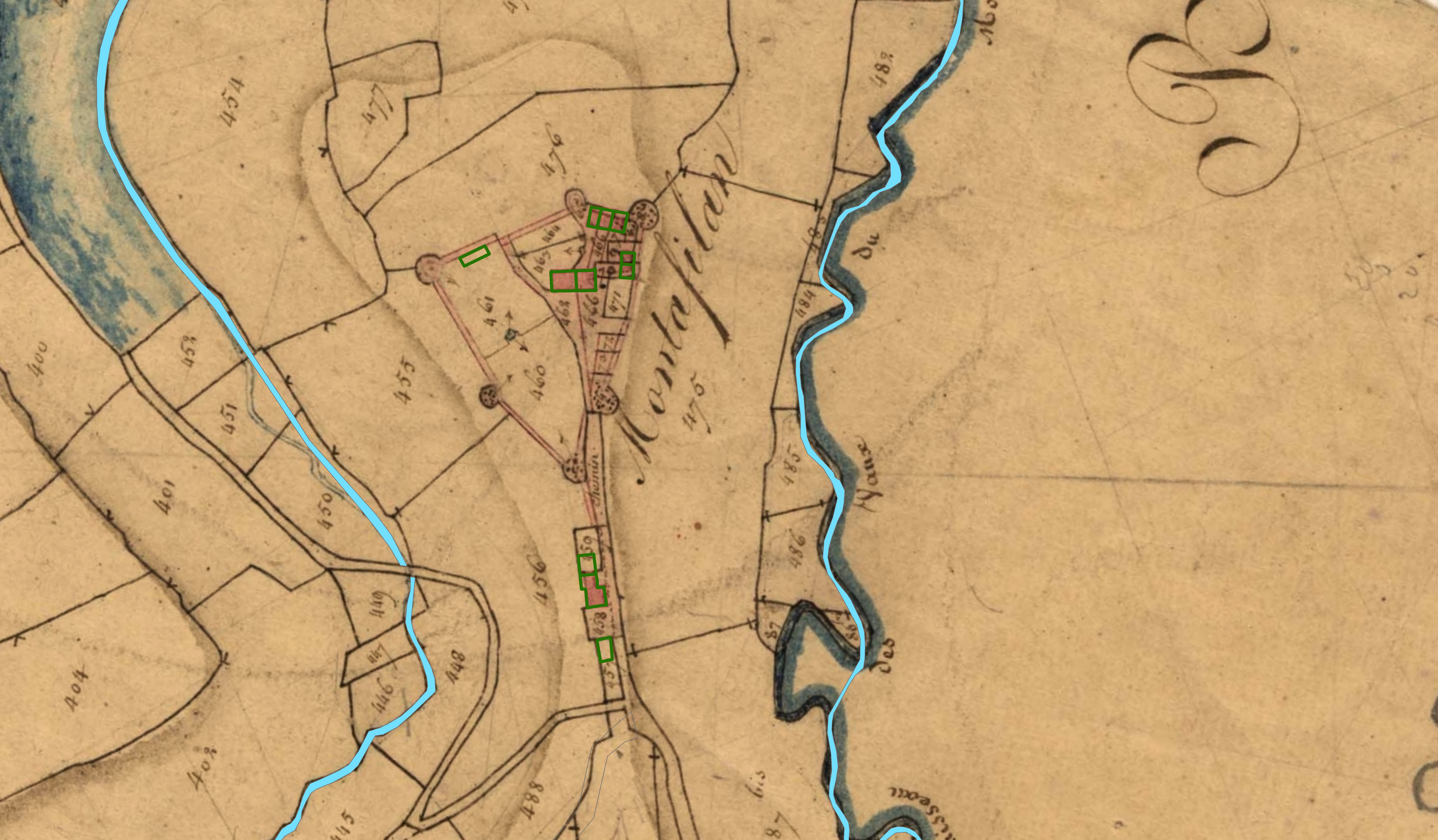 Cadastre actuel (vert) superposé au cadastre ancien de 1827, section I2, La hautièreImmatriculation