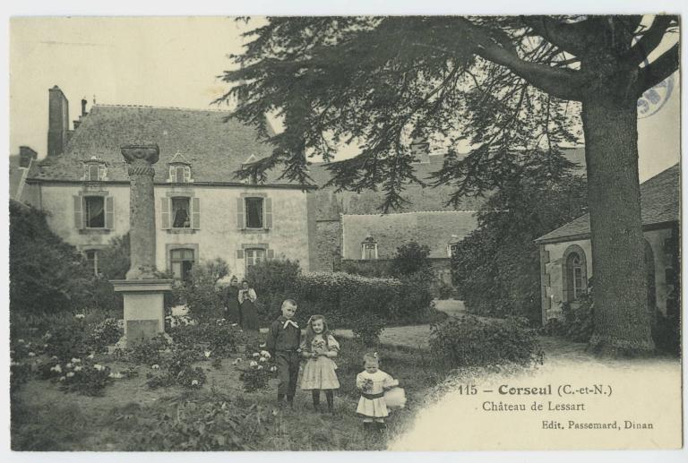 Vue générale du manoir de Lessart, avec colonne de Jupiter, carte postale ancienne conservée aux archives départementales d'Ille-et-VilaineImmatriculation