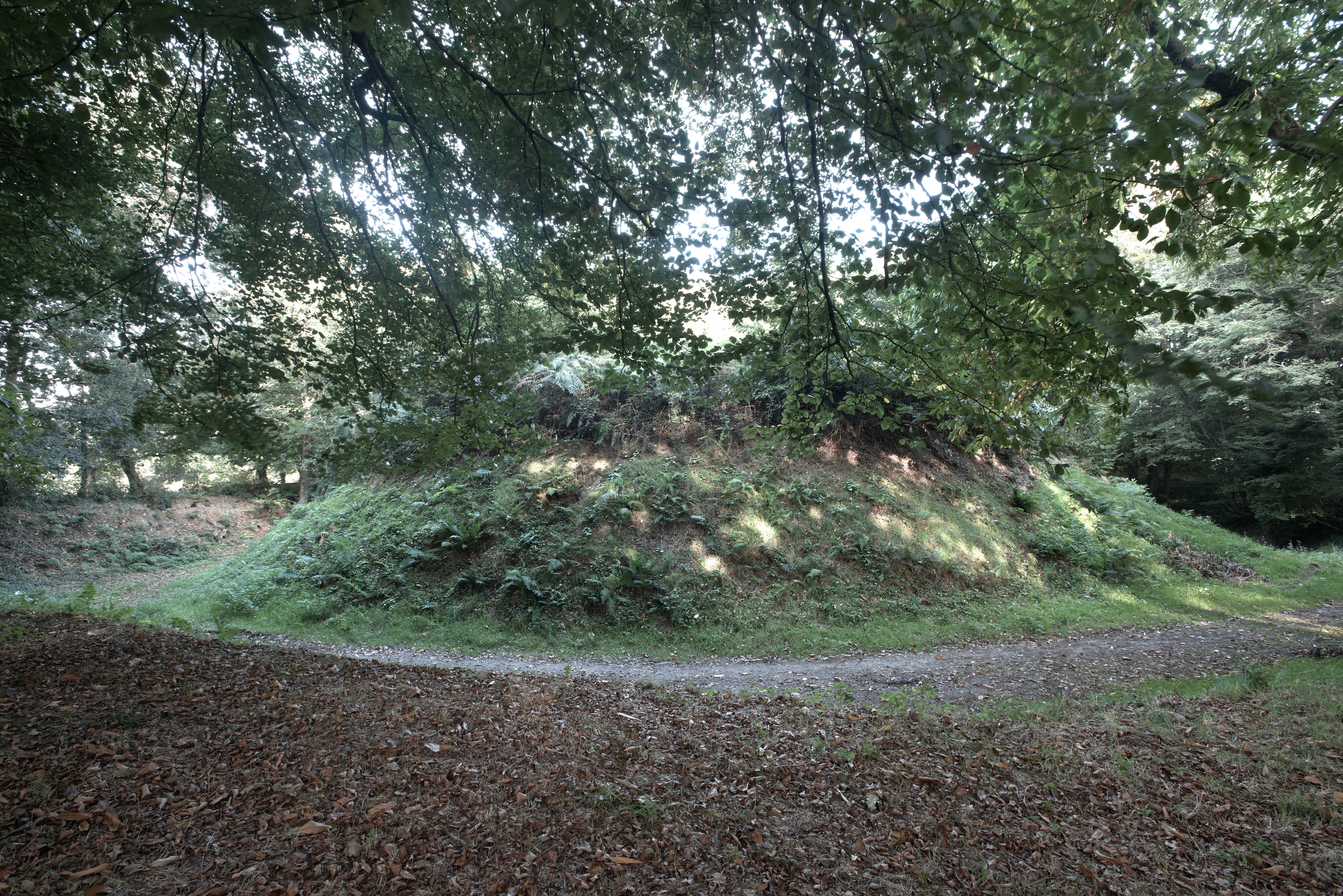 Vue générale de la motte depuis le sud, état en 2016. Elle est entourée d'un fossé annulaireImmatriculation