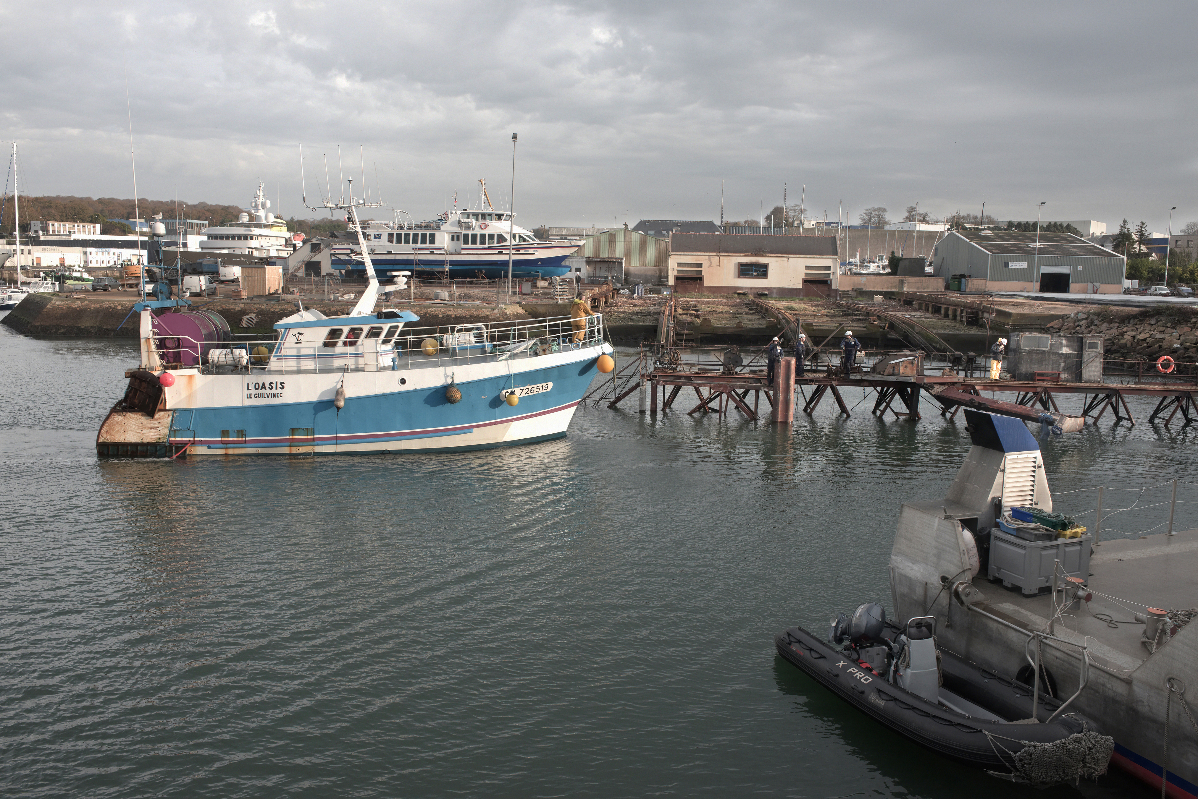 Bateau de pêche se positionnant pour être parallèle à la passerelle et centré pour être bloqué par le bras d'accueil.Immatriculation