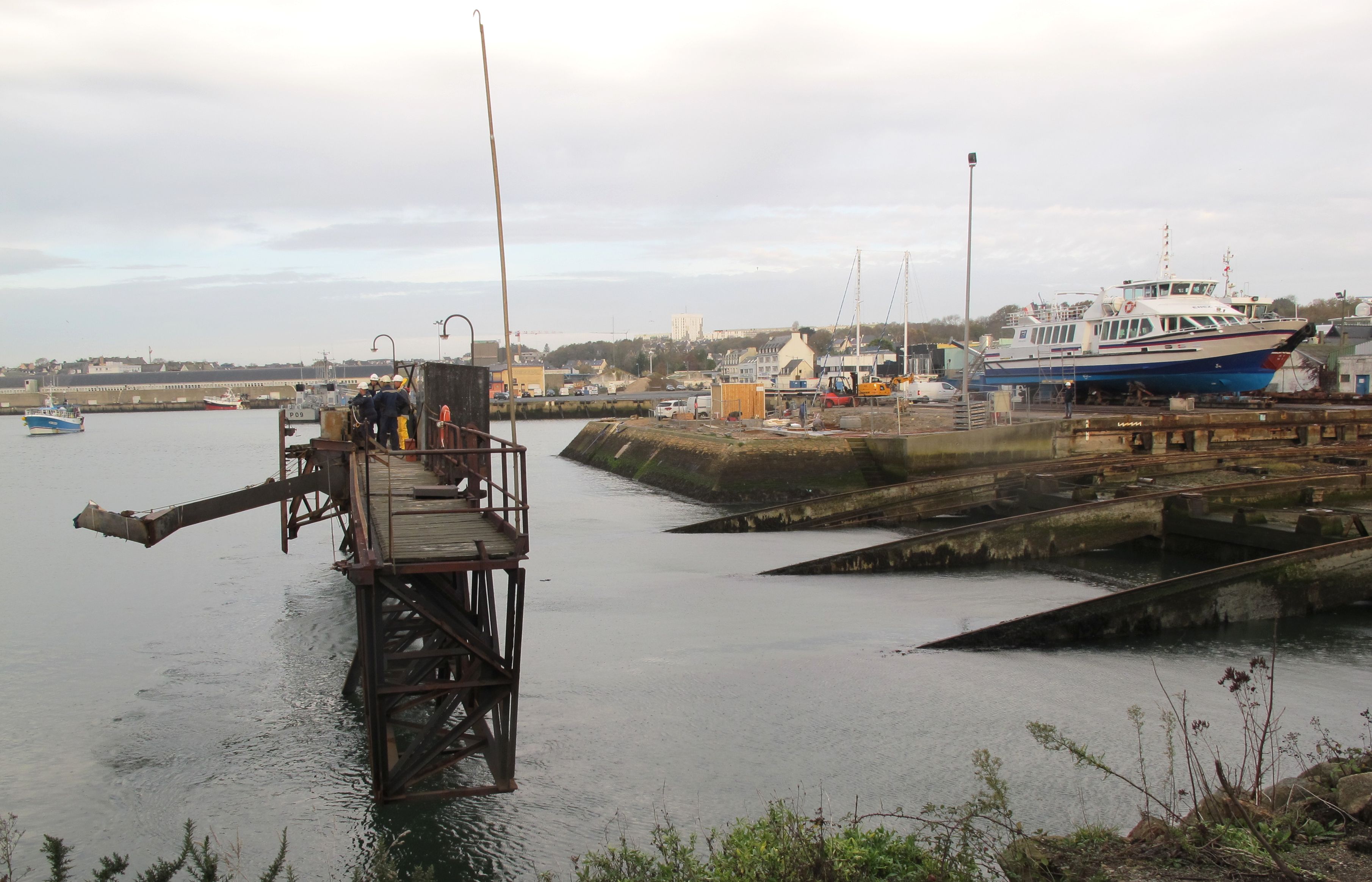 Bateau de pêche en approche ; passerelle en partie basse du slipway ; rampe du slipwayImmatriculation