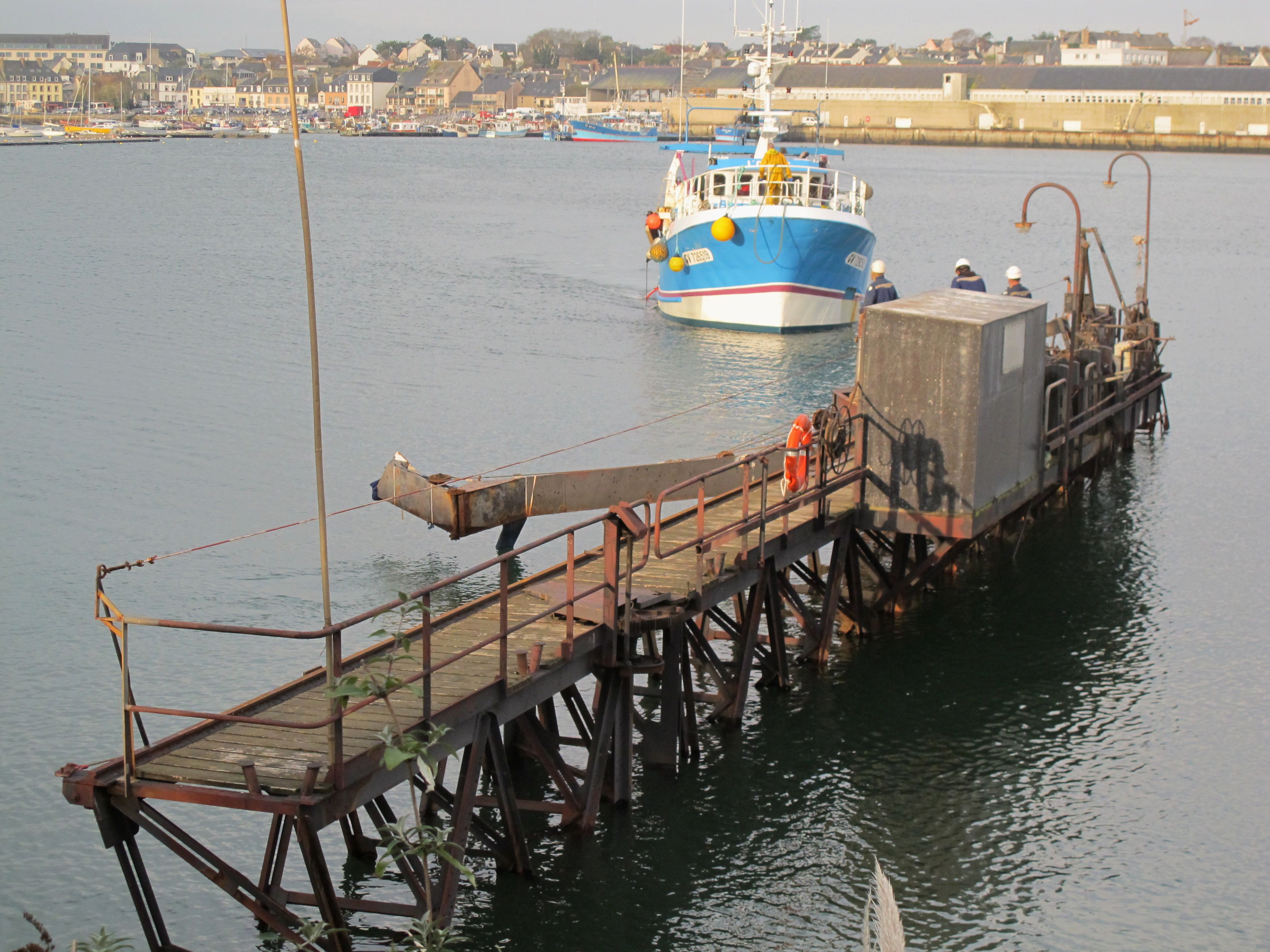 Bateau de pêche en approche ; l'étrave doit se positionner dans le "coude" du brasImmatriculation