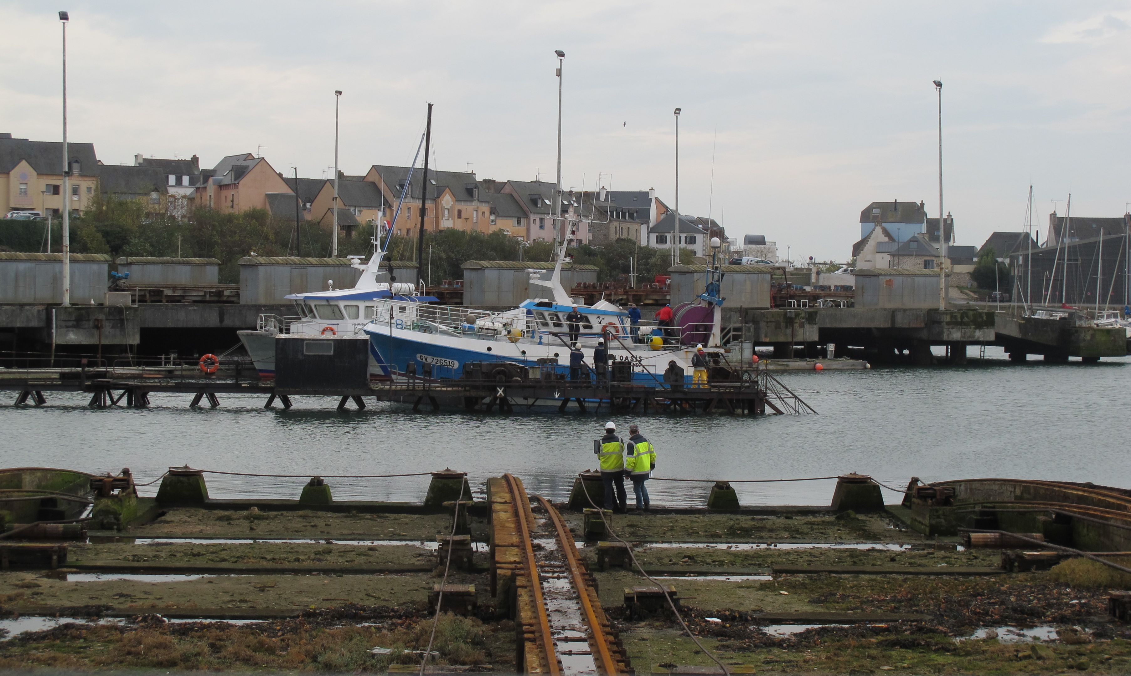 Slipway, passerelle : points de repères sur la passerelle croix et flèche pour positionner le bateau par rapport au chariotImmatriculation