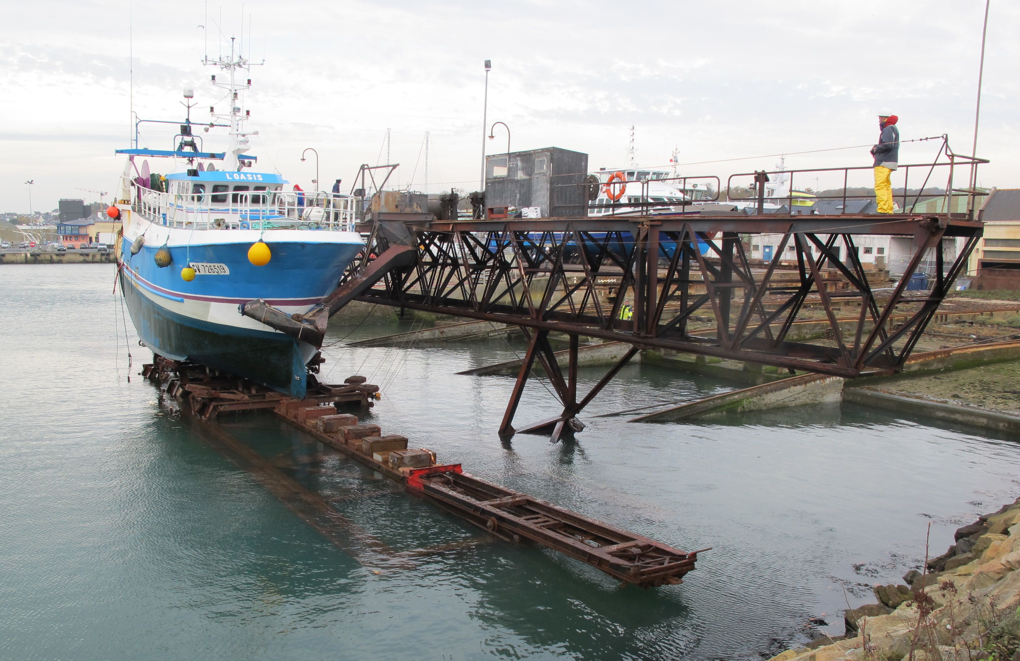 Sortie de l'eau : la passerelle recule vers le slipway, le bateau est posé et maintenu sur le chariotImmatriculation