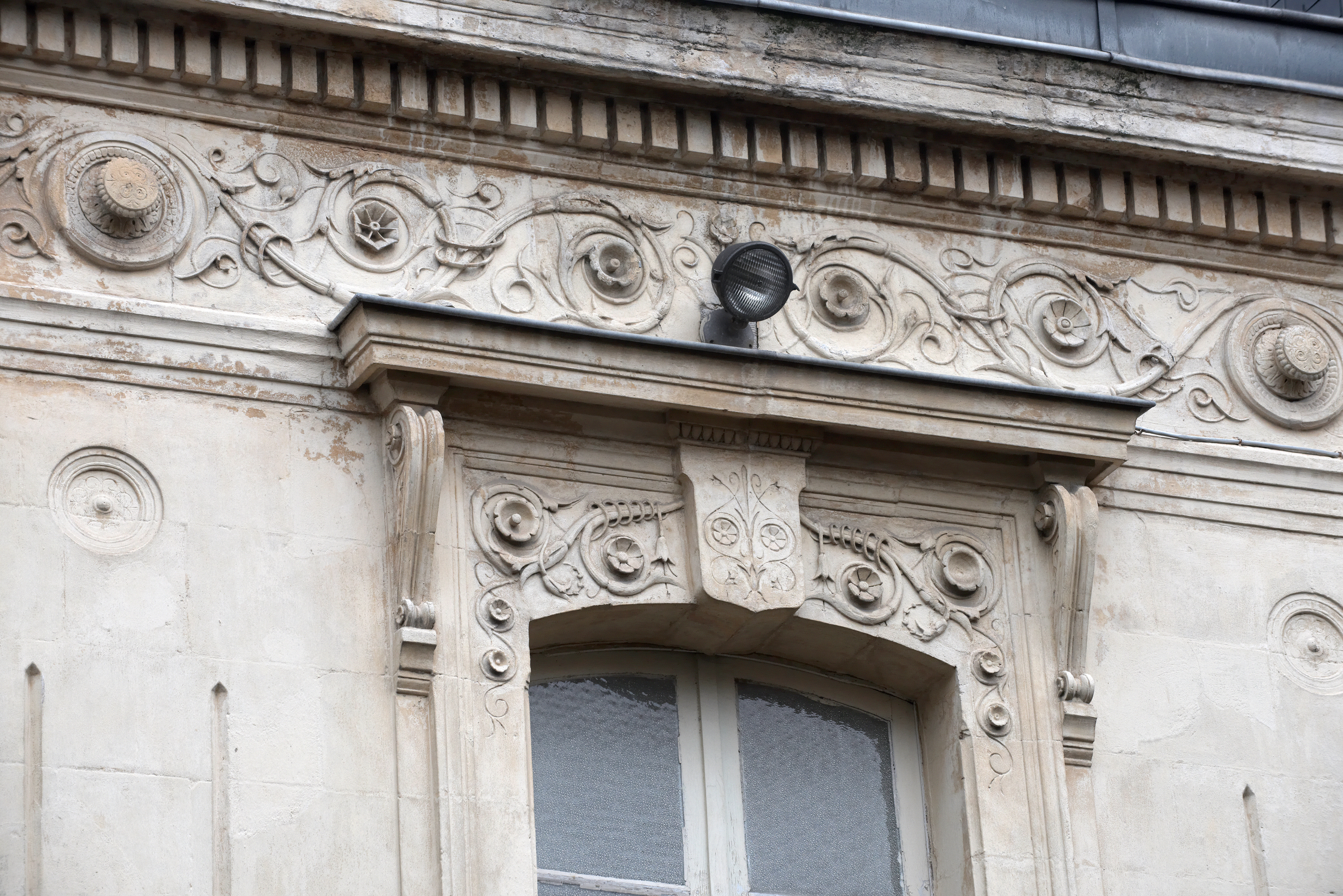 Vue de détail du décor de la façade à l'étageImmatriculation