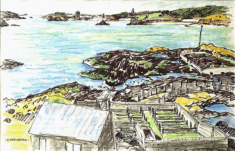 La Richardais, culture de bigorneaux près de Saint-Servan, dessin par Yvonne Jean-Haffen. Entre 1960 et 1970Immatriculation