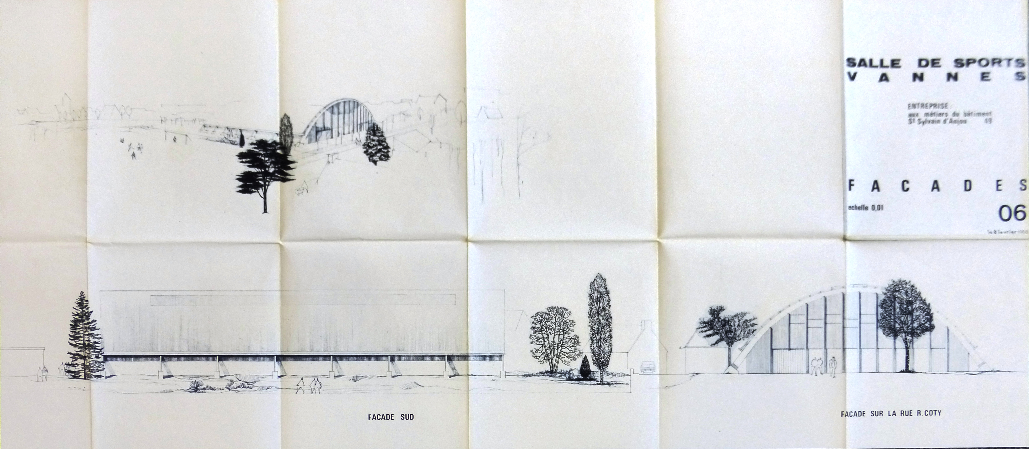 AD Morbihan : 111 J 214. Vue perspective et façades. Aux Métiers du Bâtiment, 1968.