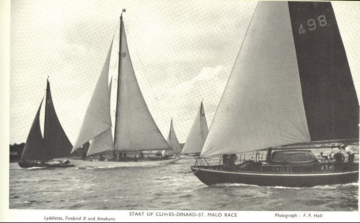 Carte postale. Start of cowes-Dianrd-St-Malo Race, Lyddiette, Firebird X and Amokura. Photograph : F.P. Hall (http://loiseaudefeu.blogspot.fr/)