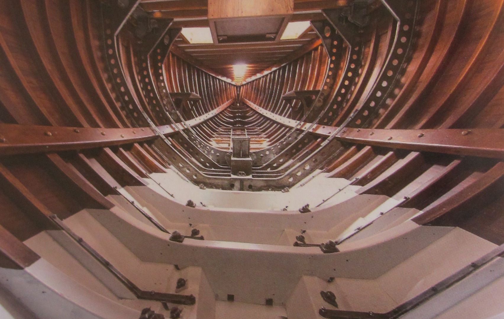 Vue intérieure : charpente en acajou (reproduction Neptunia)Immatriculation