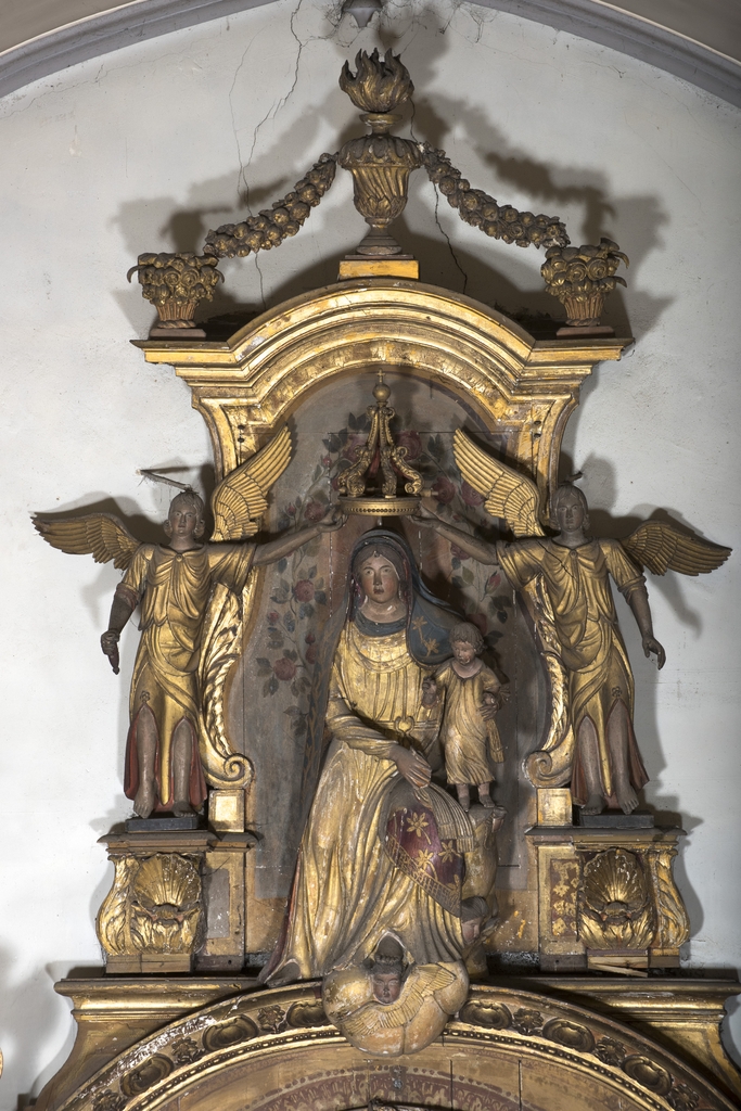 Chapelle Sainte Marie-Madeleine. Retable, 1676. Détail de la niche supérieure : le couronnement de la ViergeImmatriculation