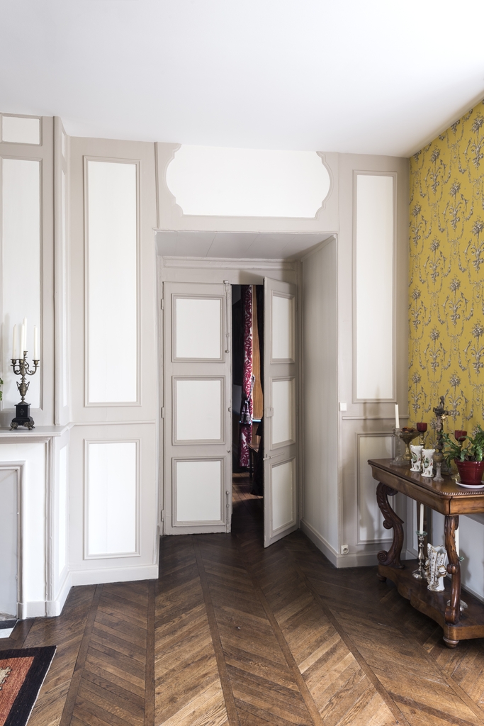 Salon. Détail de la porte à double battant et épaulements boisés sur toute la hauteurImmatriculation