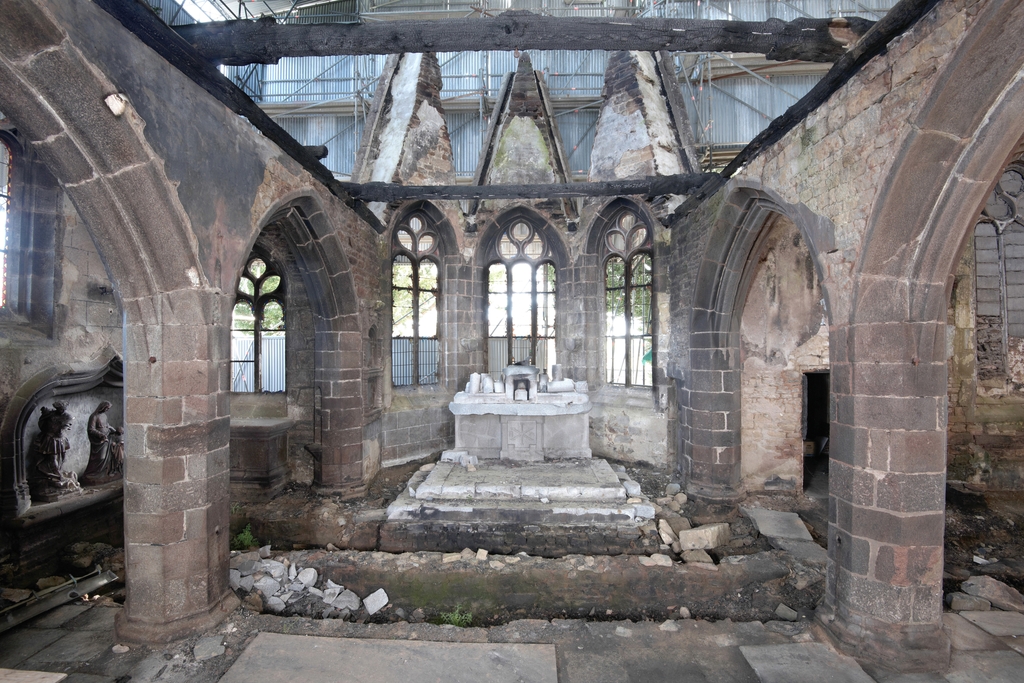 Trémel, le bourg : église paroissiale Notre-Dame, vue intérieure, chœur (après l'incendie le 21 juin 2016)Immatriculation