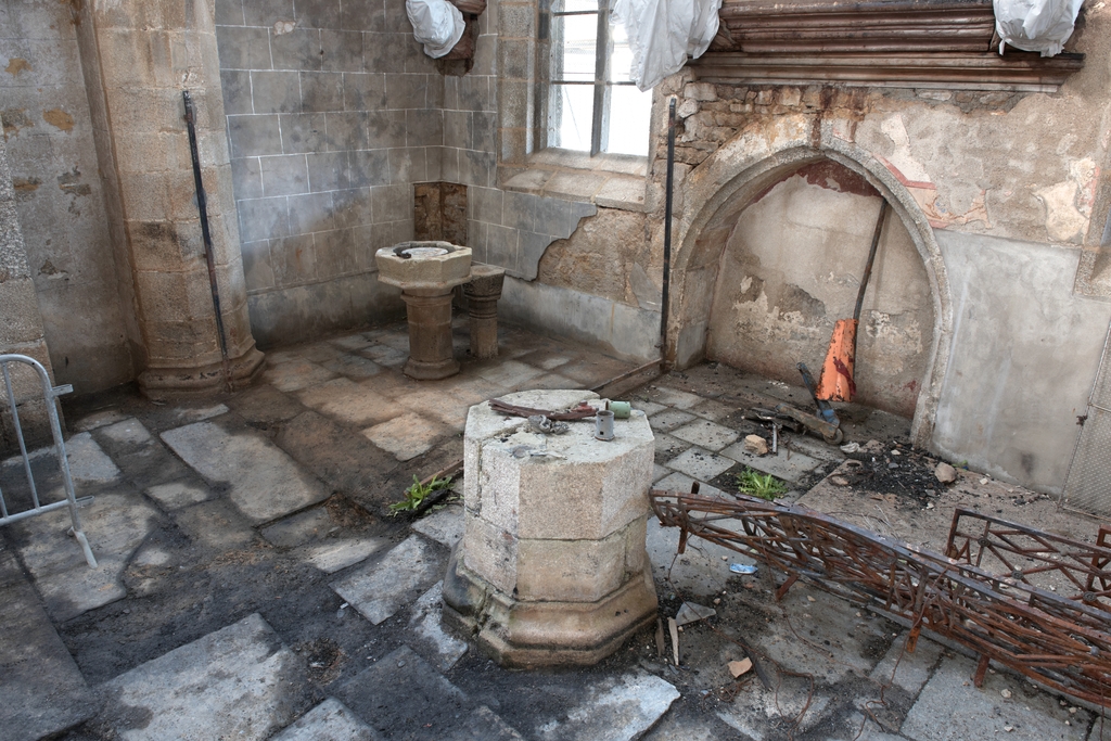 Trémel, le bourg : église paroissiale Notre-Dame, vue intérieure, emplacement de la chapelle des fonts baptismaux (après l'incendie du 21 juin 2016)Immatriculation