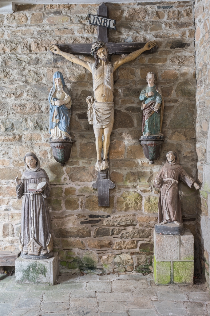 Cloître. Ensemble de statues provenant d'une poutre de gloire (Christ en croix, Vierge à l'Enfant, saint Jean)Immatriculation
