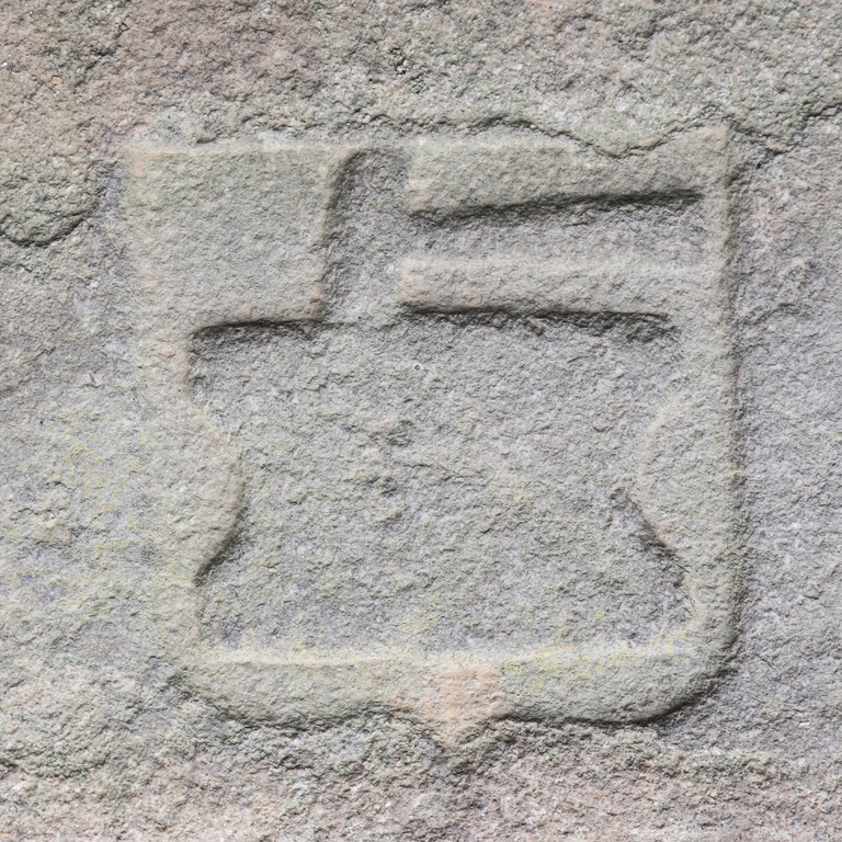 Allée du cloître. Détail d'armoiries provenant d'une pierre tombaleImmatriculation