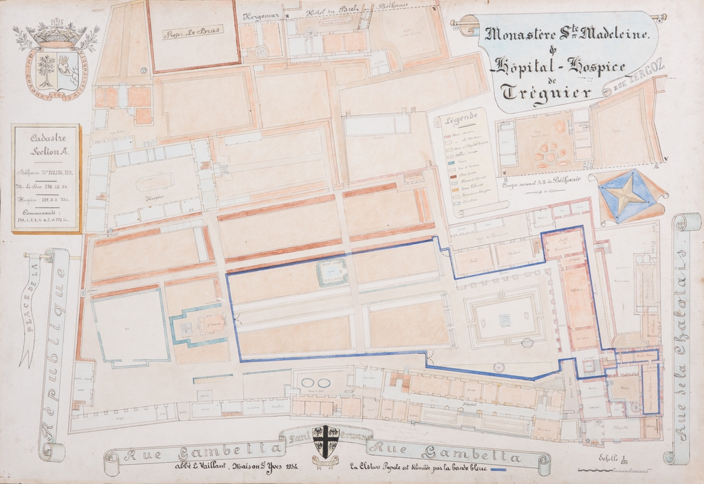 Plan général du couvent des Augustines alors monastère Sainte-Madeleine et hôpital-hospice de Tréguier par l'abbé Le Vaillant de la maison Saint-Yves, 1954. Au nord figure le manoir urbain de la rue Kercoz dit "Hôtel du But" ou "Béthanie" et le manoir de Kergomar (aujourd'hui détruit)Immatriculation