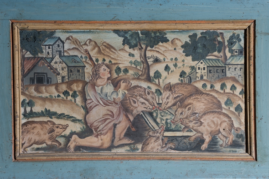 Ensemble de petits tableaux sur le pourtour du lambris de couvrement. DétailImmatriculation
