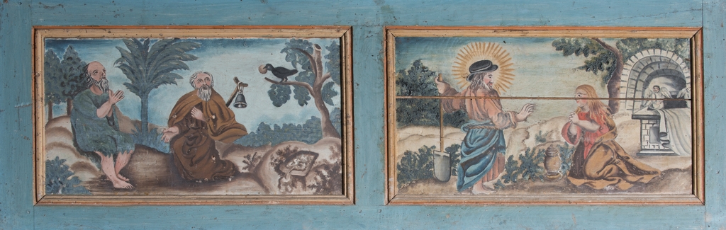 Ensemble de petits tableaux sur le pourtour du lambris de couvrement. Détail : Rencontre de saint Antoine et de saint Paul de Thèbes ; Le Christ ressuscité avec Marie-MadeleineImmatriculation