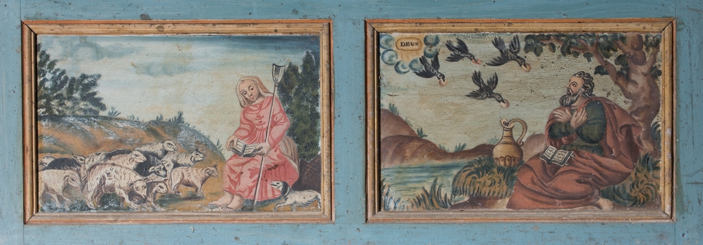 Ensemble de petits tableaux sur le pourtour du lambris de couvrement. DétailImmatriculation