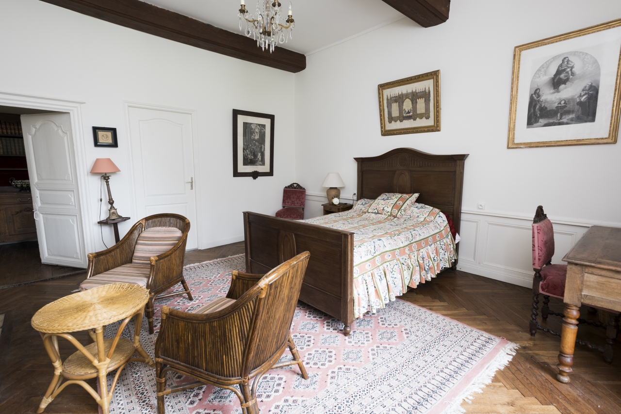 Premier étage. Grande chambre bout à l'est avec une porte donnant sur l'antichambre et une porte donnant sur le cabinet. Vue généraleImmatriculation
