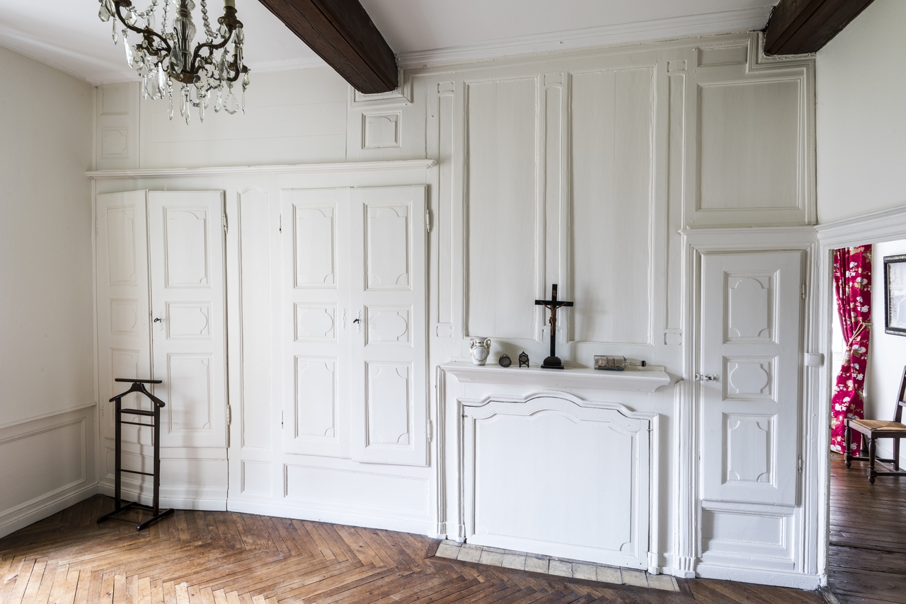 Premier étage. Grande chambre bout à l'est. Cheminée boisée encadrée de trois armoires d'attache dont l'une à usage de bibliothèqueImmatriculation