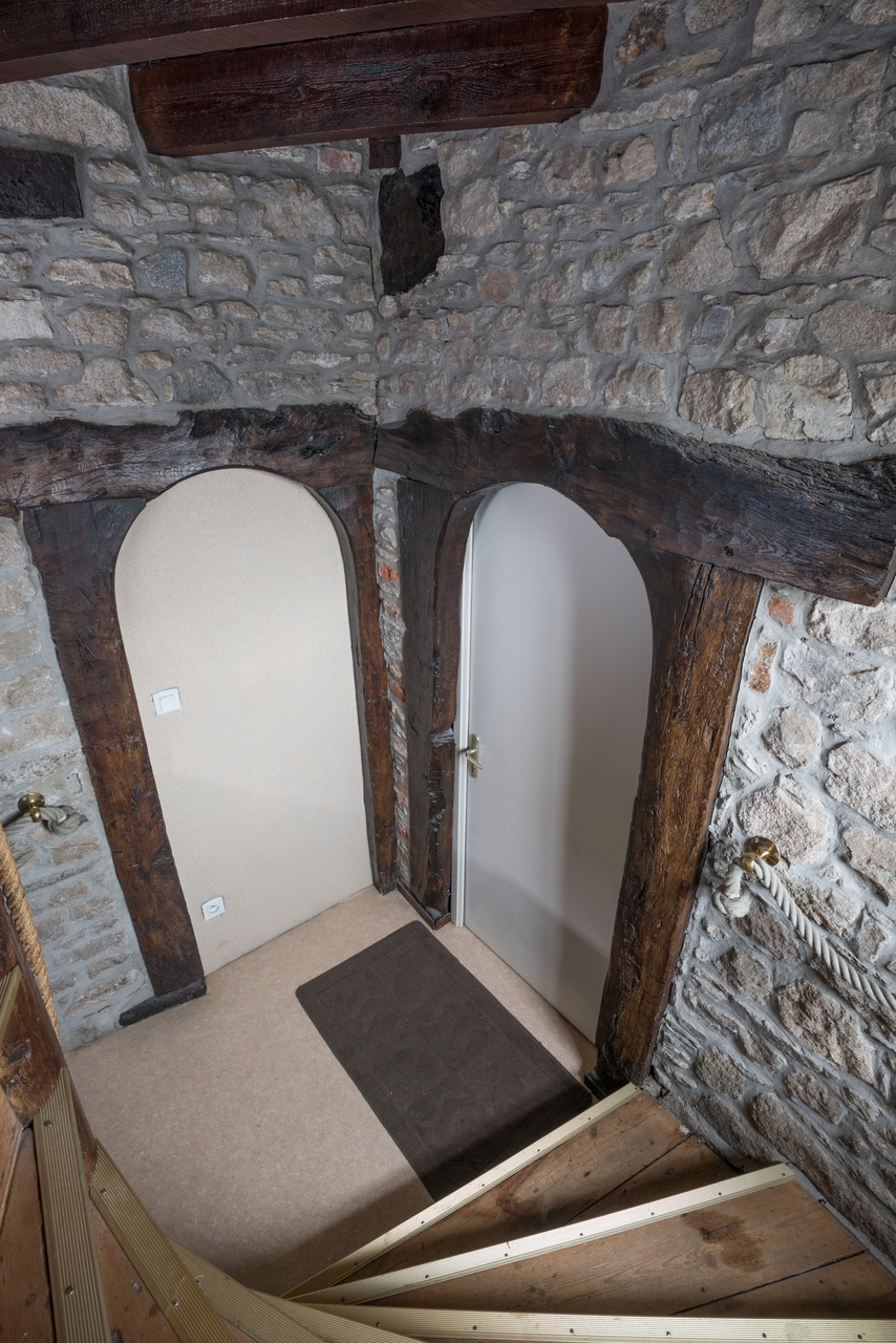 Tréguier, 6 Place du Général de Gaulle : maison d'armateur actuellement "pharmacie des Quais", escalier en vis, portes du palier, entourage en bois en arc plein cintreImmatriculation