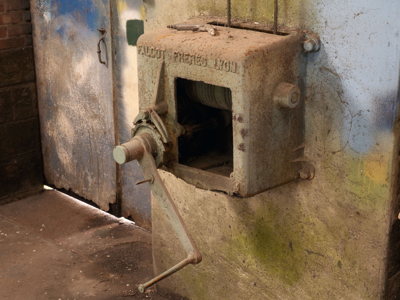 Tréguier, rue du Guindy : abattoir public municipal, halle, vue intérieure, détail d'un treuil manuelImmatriculation
