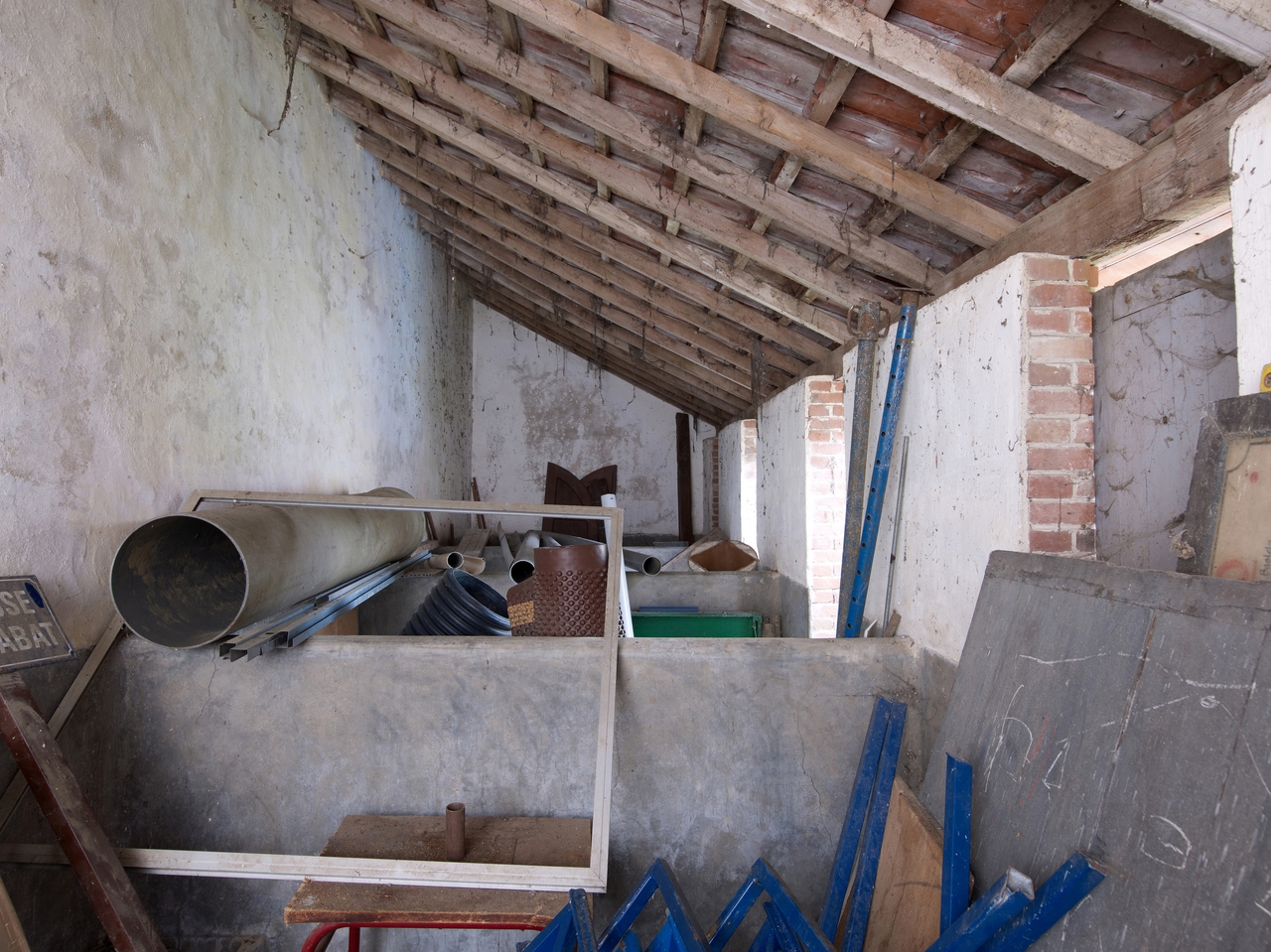 Tréguier, rue du Guindy : abattoir public municipal, longue étable à boxes individuels (à veaux, à moutons et à porcs) en appentis contre le mur de clôture, vue intérieureImmatriculation