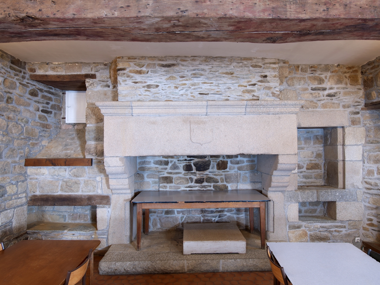 Aile nord. Salle du rez-de-chaussée. Pignon nord, cheminée armoriée, corniche et piédroits moulurésImmatriculation