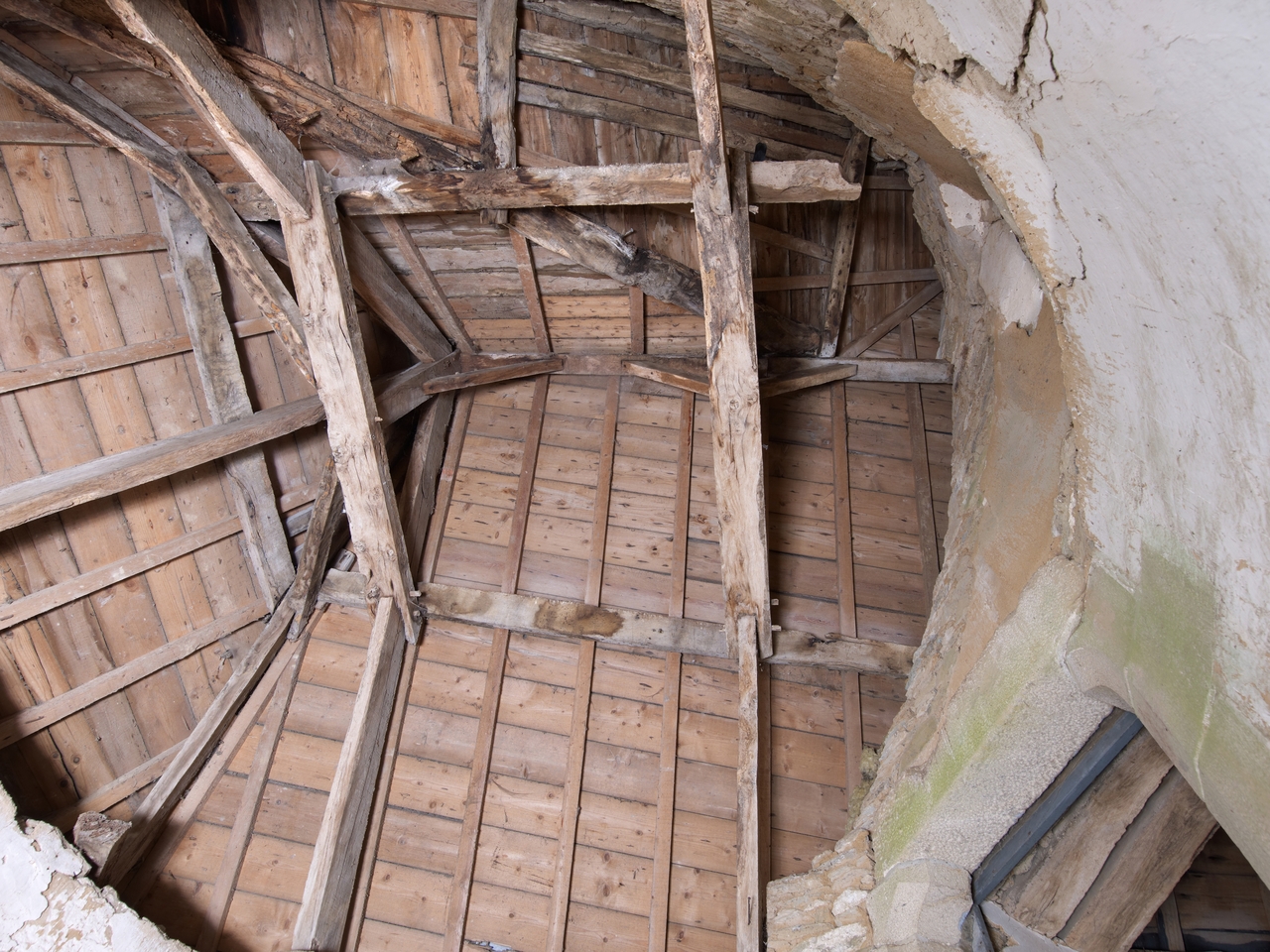 Corps de logis. Escalier en vis en pierre. Vue de la charpenteImmatriculation