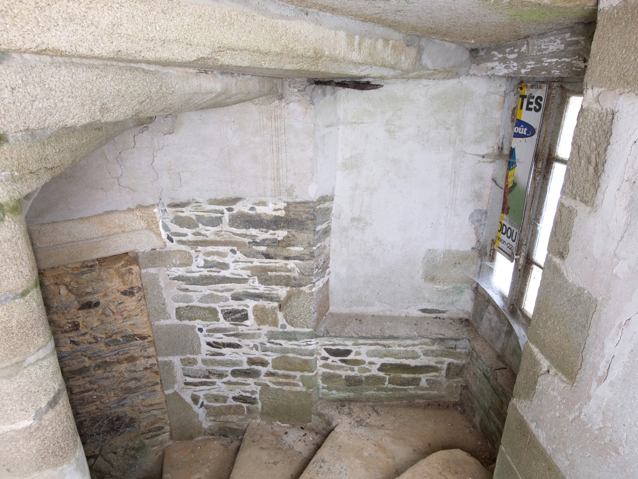 Corps de logis. Escalier en vis en pierre. Détail d'une baie à coussiège du premier étage offrant une vue sur le Guindy au nordImmatriculation