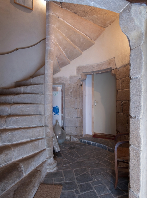 Tréguier, 22 rue Colvestre : manoir urbain dit "Maison de Jean V", tour d'escalier (à gauche : escalier en vis ; au centre : petite porte donnant sur un couloir - disparu - et la cour ; à droite : porte donnant sur la pièce arrière identifiée comme "office" ; à l'extrême droite - non visible - : la porte donnant sur le petit cellier)Immatriculation