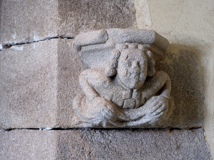 Tréguier, 22 rue Colvestre : manoir urbain dit "Maison de Jean V", deuxième étage, chapelle privée, détail de la console droite sculptée en culotImmatriculation