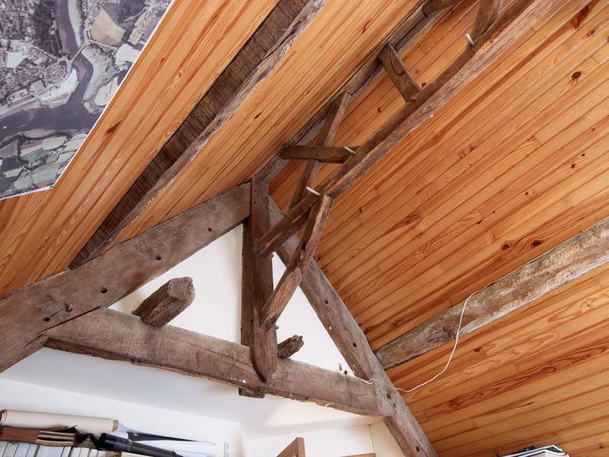 Tréguier, 22 rue Colvestre : manoir urbain dit "Maison de Jean V", étage de combles - autrefois "chambre sous charpente", détail de la charpenteImmatriculation