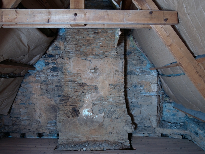Aile nord. Pignon nord de l'étage en surcroît, conduit de cheminée et vestiges d'une lucarne d'angle orientée vers le GuindyImmatriculation