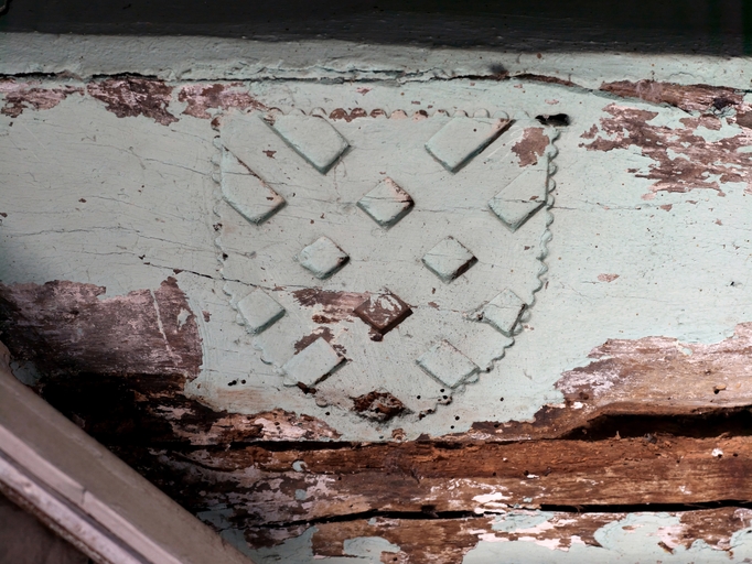 Corps de logis. Détail d'une poutre avec le blason de la famille de Guermeur (?) "de sable fretté d'or de six pièces"Immatriculation