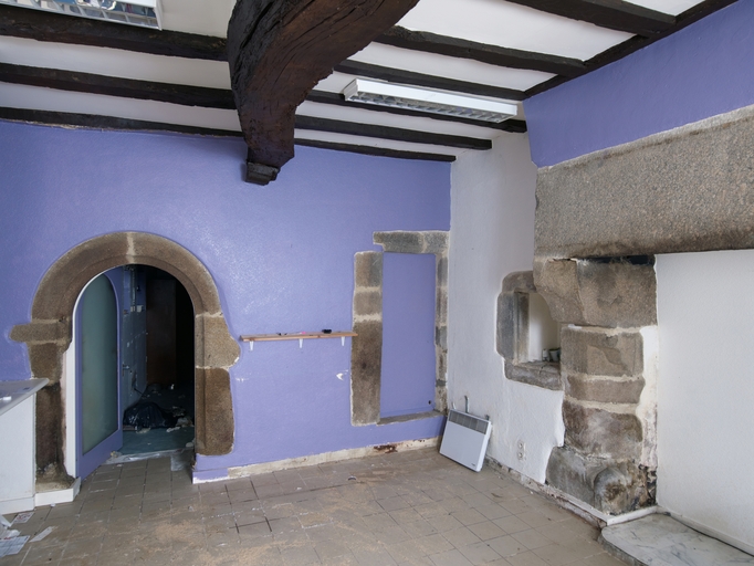 Tréguier, 13 rue Colvestre : manoir urbain dit "Maison des Trois Avocats", rez-de-chaussée, cheminée, niche et portes de communication (à linteau droit et en arc plein cintre)Immatriculation