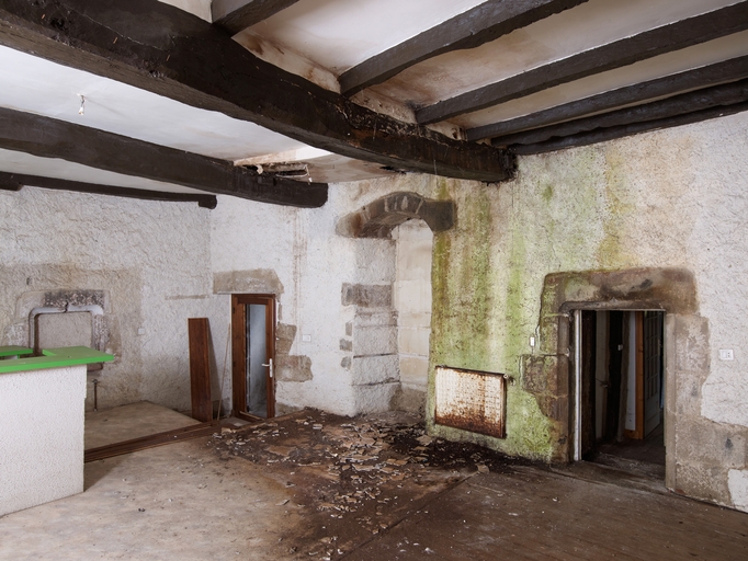 Tréguier, 13 rue Colvestre : manoir urbain dit "Maison des Trois Avocats", premier étage, grande salle. De gauche à droite : niche-crédence à accolade (il pourrait également s'agir d'un passe plat), porte permettant l'accès à l'escalier en vis, fenêtre ancienne (vers le sud, murée) et porte de communication (à linteau droit à accolade) de l'aile en retour d'équerre vers le sudImmatriculation