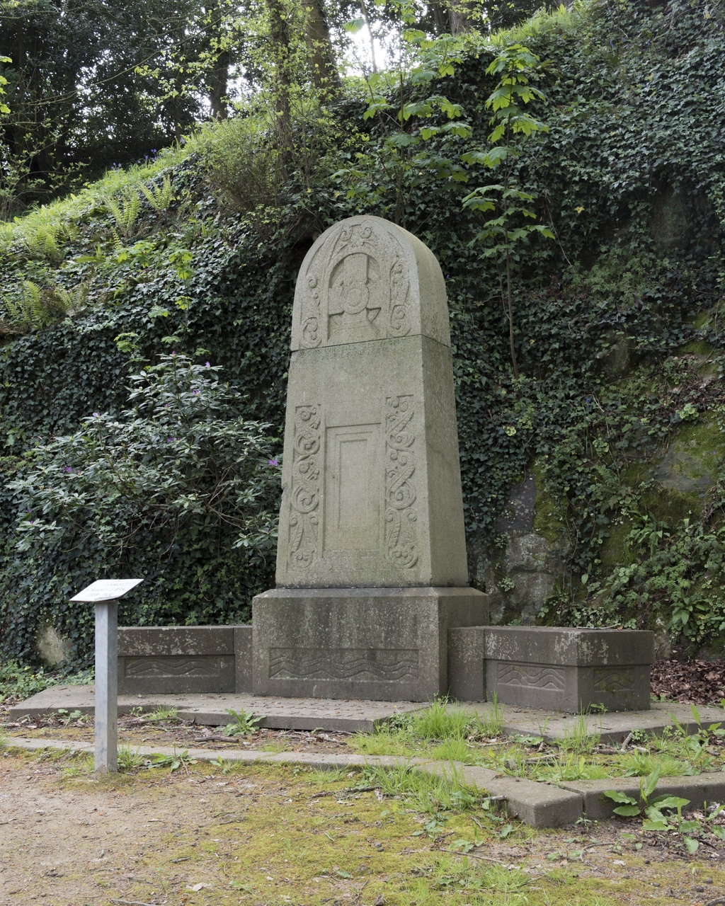 Tréguier, "Bois de l'Évêché" aujourd'hui "Bois du Poète" : détail du monument funéraire et tombe de Anatole Le Braz, croix celtique (croix dans laquelle s'inscrit un anneau) et décor de rinceaux (arabesque de feuillages)Immatriculation