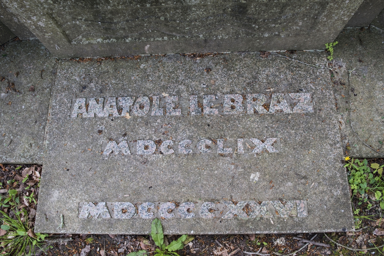 Tréguier, "Bois de l'Évêché" aujourd'hui "Bois du Poète" : détail du monument funéraire et tombe de Anatole Le Braz. Au pied de la stèle, on peut lire l'inscription suivante : "Anatole Le Braz / MDCCCLIX / MDCCCCXXVI"Immatriculation