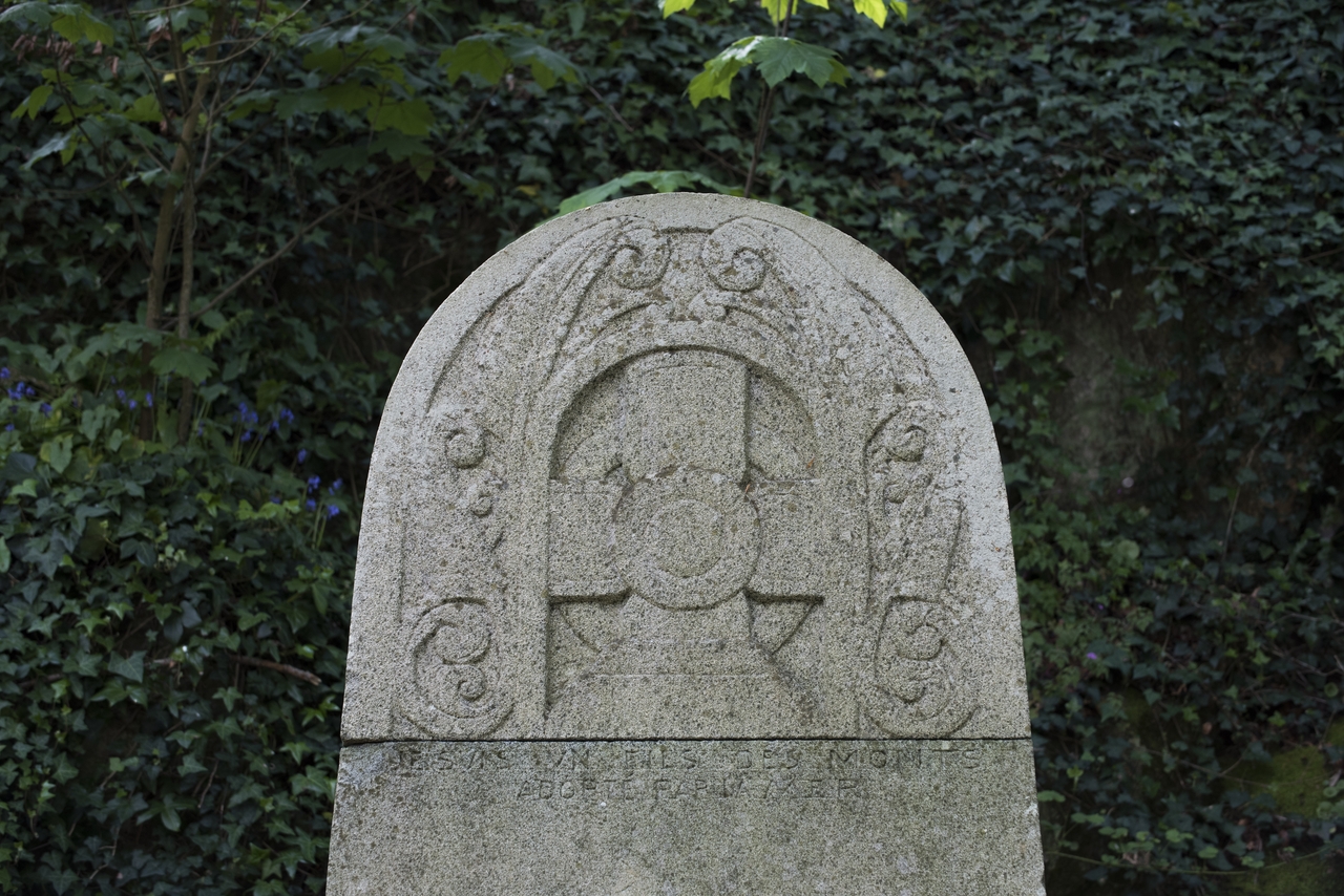 Tréguier, "Bois de l'Évêché" aujourd'hui "Bois du Poète" : détail du monument funéraire et tombe de Anatole Le Braz, croix celtique (croix dans laquelle s'inscrit un anneau) et décor de rinceaux (arabesque de feuillages)Immatriculation