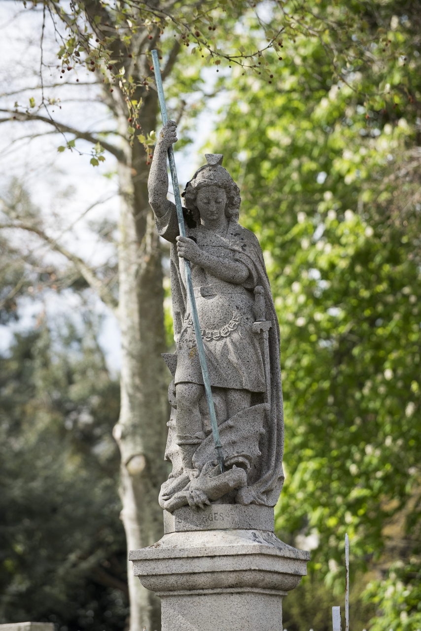 Tréguier, rue Marcellin Berthelot - Parc de la Baronnais : calvaire de Réparation, détail de la statue de saint Georges terrassant le dragon de sa lanceImmatriculation