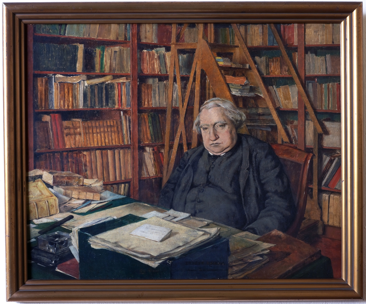 Huile sur toile. Ernest Renan dans son cabinet de travail au collège de France, signé Ary RenanImmatriculation