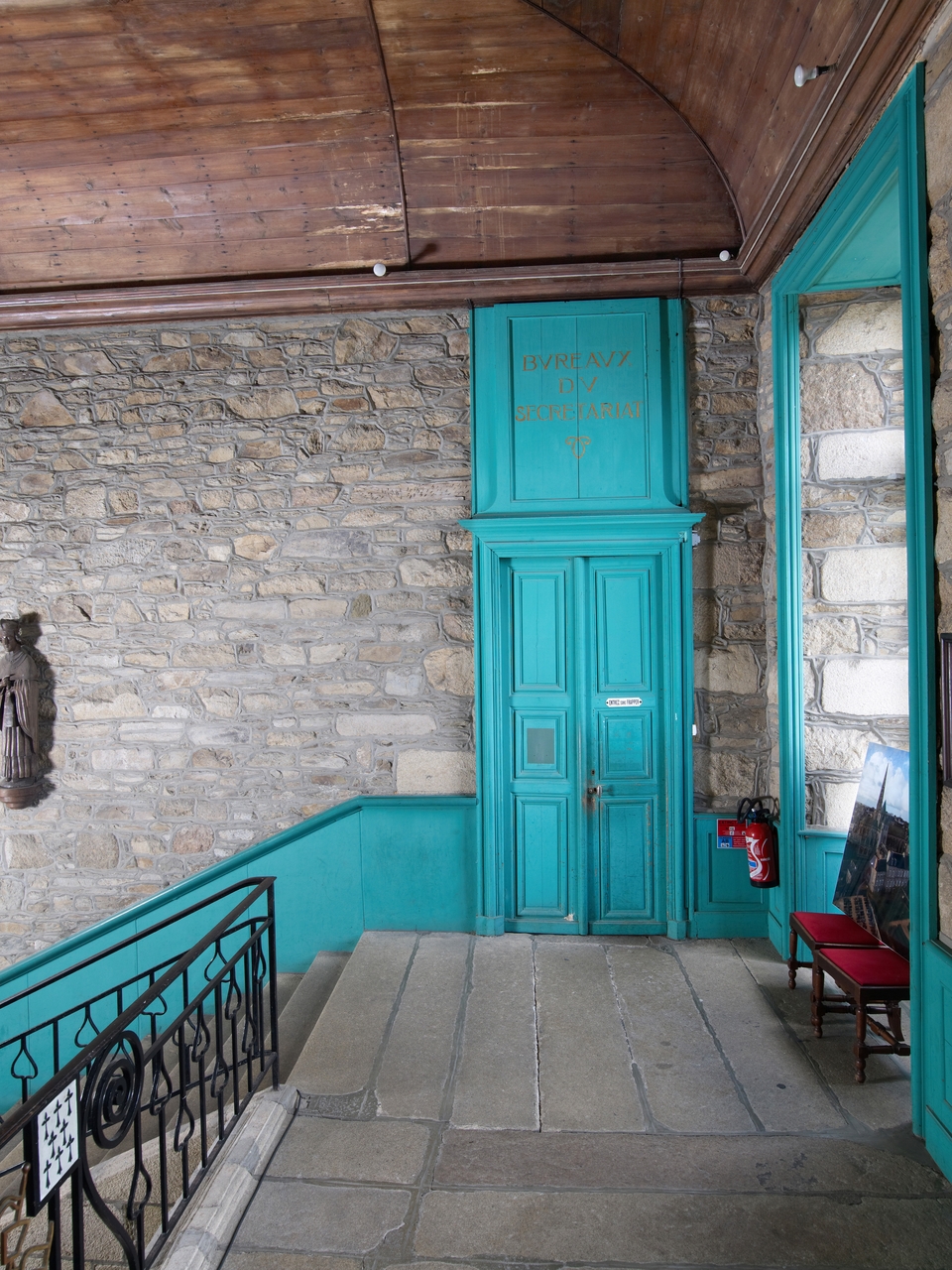 Tréguier, boulevard Anatole Le Braz : palais épiscopal aujourd'hui mairie et bibliothèque, corps principal, vestibule et escalier d'honneur, palier, porte ouest. On peut lire l'inscription suivante : "BVREAVX DU SECRETARIAT"Immatriculation