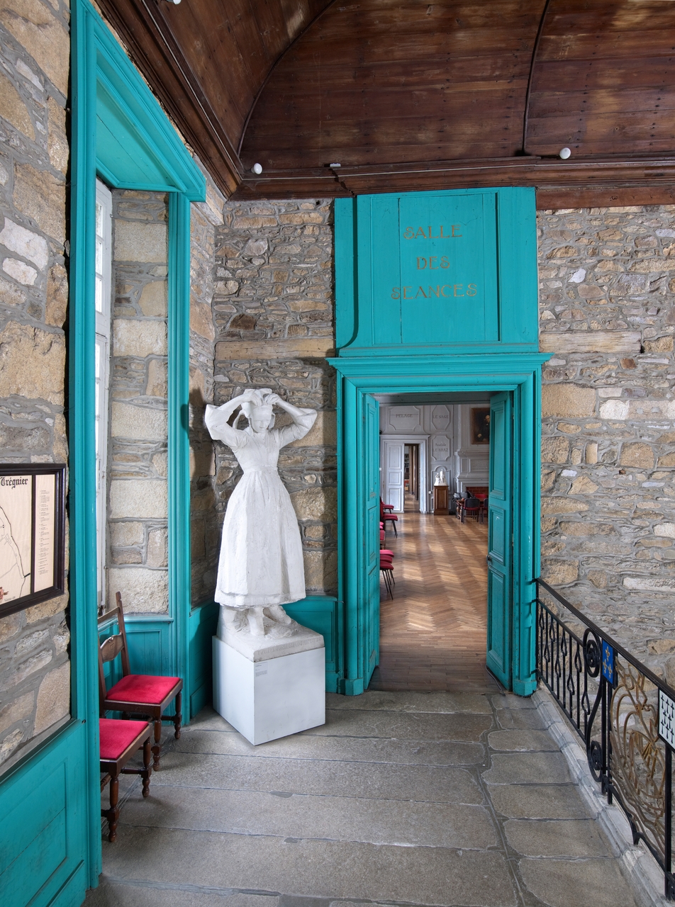 Tréguier, boulevard Anatole Le Braz : palais épiscopal aujourd'hui mairie et bibliothèque, corps principal, vestibule et escalier d'honneur, palier, porte est donnant sur la salle du conseil. On peut lire l'inscription suivante : "SALLE DES SEANCES". Sur le palier, étude de Armel Beaufils, "La dernière épingle" (Jeune fille en pied portant le costume de Plougastel-Daoulas : jupe et tablier, gilet et corselet, chaussée de sabots. Debout, elle a les bras levés et ajuste les épingles de sa coiffe...)Immatriculation