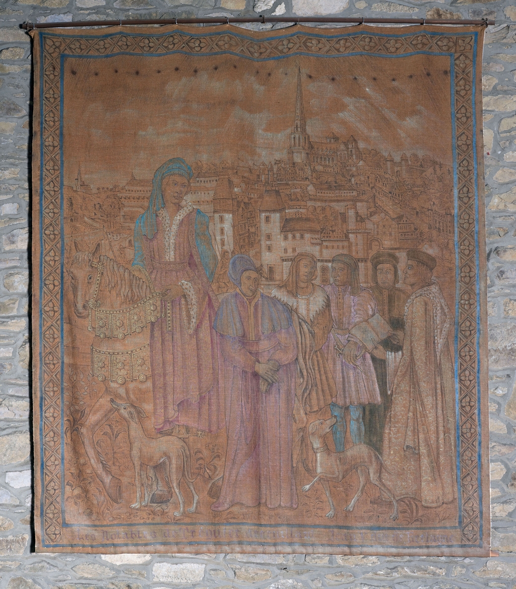 Tréguier, boulevard Anatole Le Braz : palais épiscopal aujourd'hui mairie et bibliothèque, corps principal, vestibule et escalier d'honneur, tapisserie représentant la ville de Tréguier. On peut lire : "Les notables de Tréguier accueillant Jean V, duc de Bretagne". On y découvre une vision fantaisiste de la villeImmatriculation