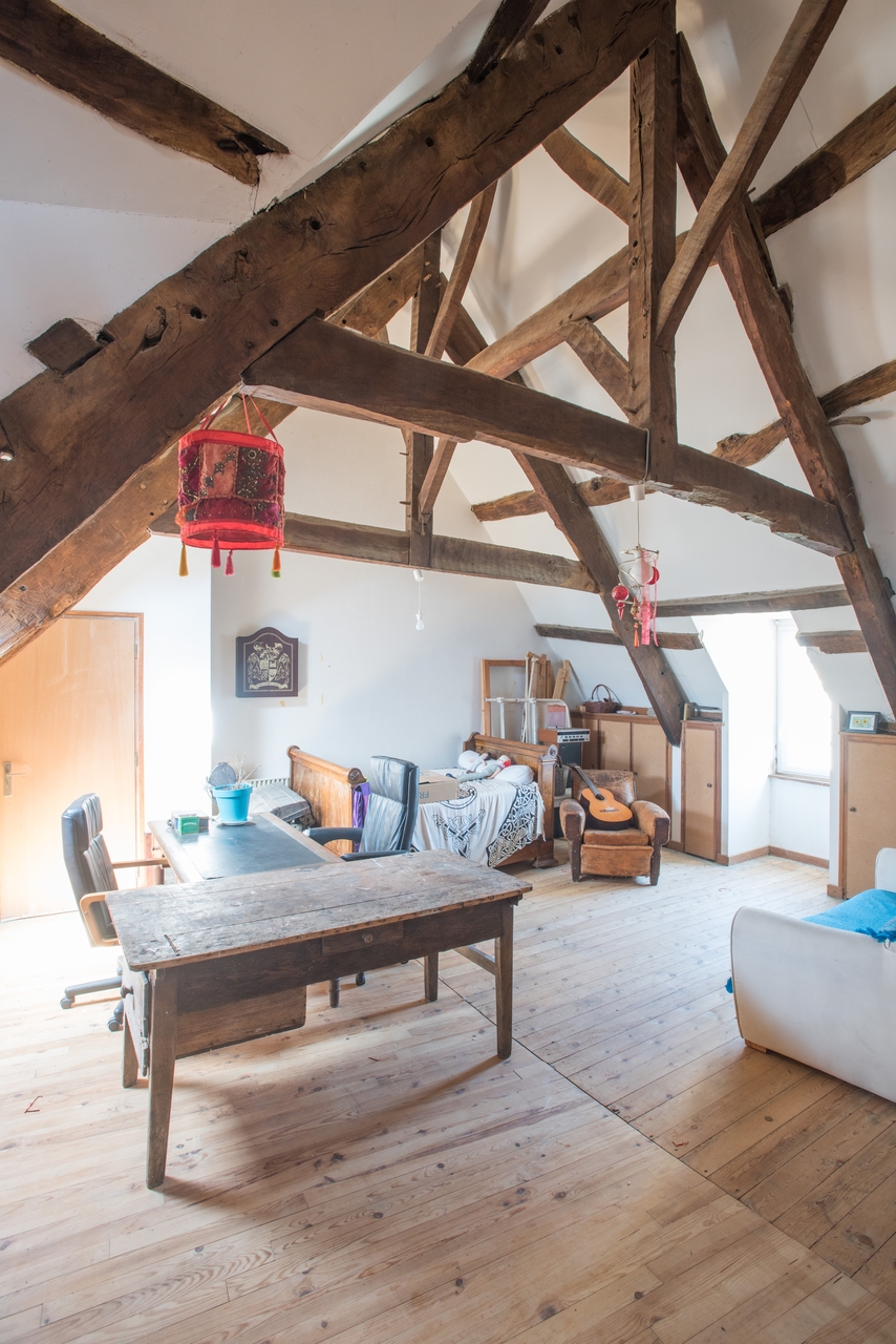 Comble à surcroît. Deux fermes à jambes-de-force engagées dans le mur. Liens placés entre les poinçons et les pannes. Vue généraleImmatriculation