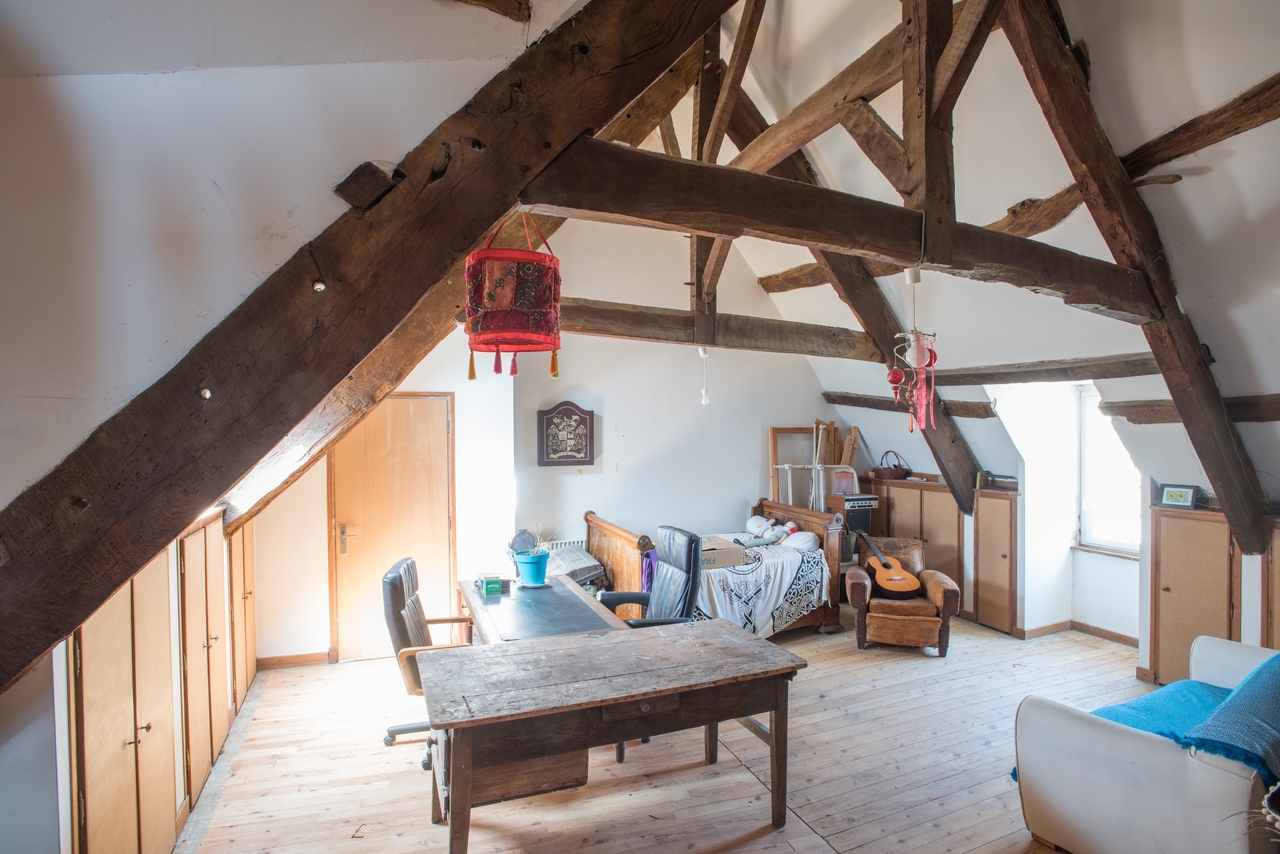 Comble à surcroît. Deux fermes à jambes-de-force engagées dans le mur. Liens placés entre les poinçons et les pannes. Vue généraleImmatriculation
